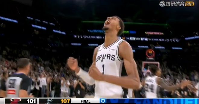 赛后,文班亚马和队友一一拥抱示意,随后振臂怒吼仰天大啸