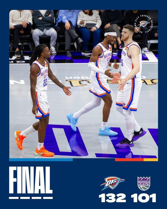 第4节,米切尔连续送出助攻,OKC依靠着团队作战,得以将分差扩大至34分,比赛早早失去了悬念。萨克拉门托追分乏力,最终,雷霆以132比101完胜对手。