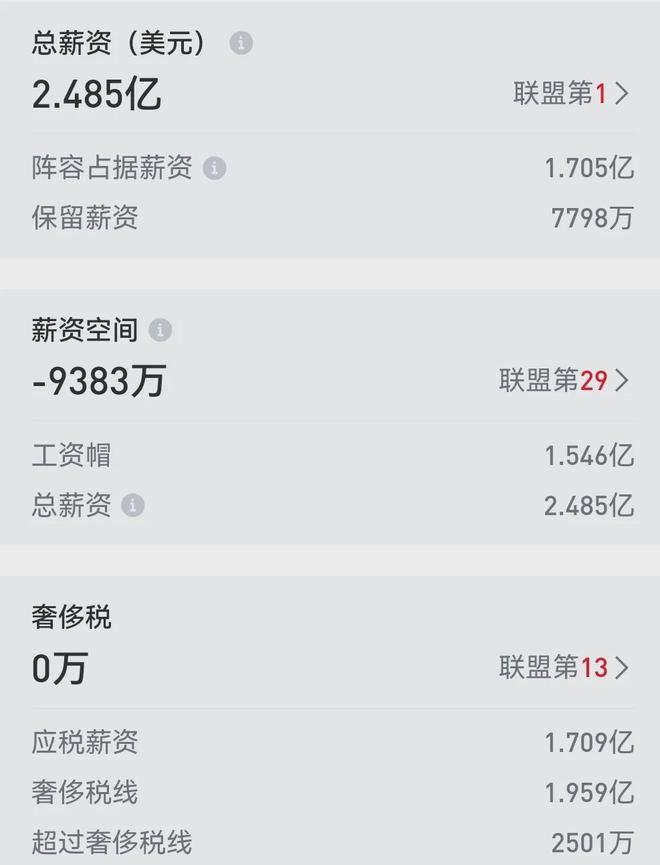 这哥们正在执行的合同2028年夏天到期,本赛季薪资4234万美元,后两个赛季薪资合计9408万美元,不算贵到离谱,但绝不是勇士可以随随便便吃得下,他们25-26赛季的总薪资已高达2.485亿美元位列联盟榜首,薪资空间-9383万美元联盟倒数第二。