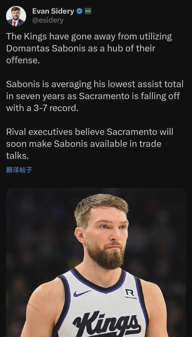 名记Sidery:国王很快就会将萨博尼斯提上交易货架......